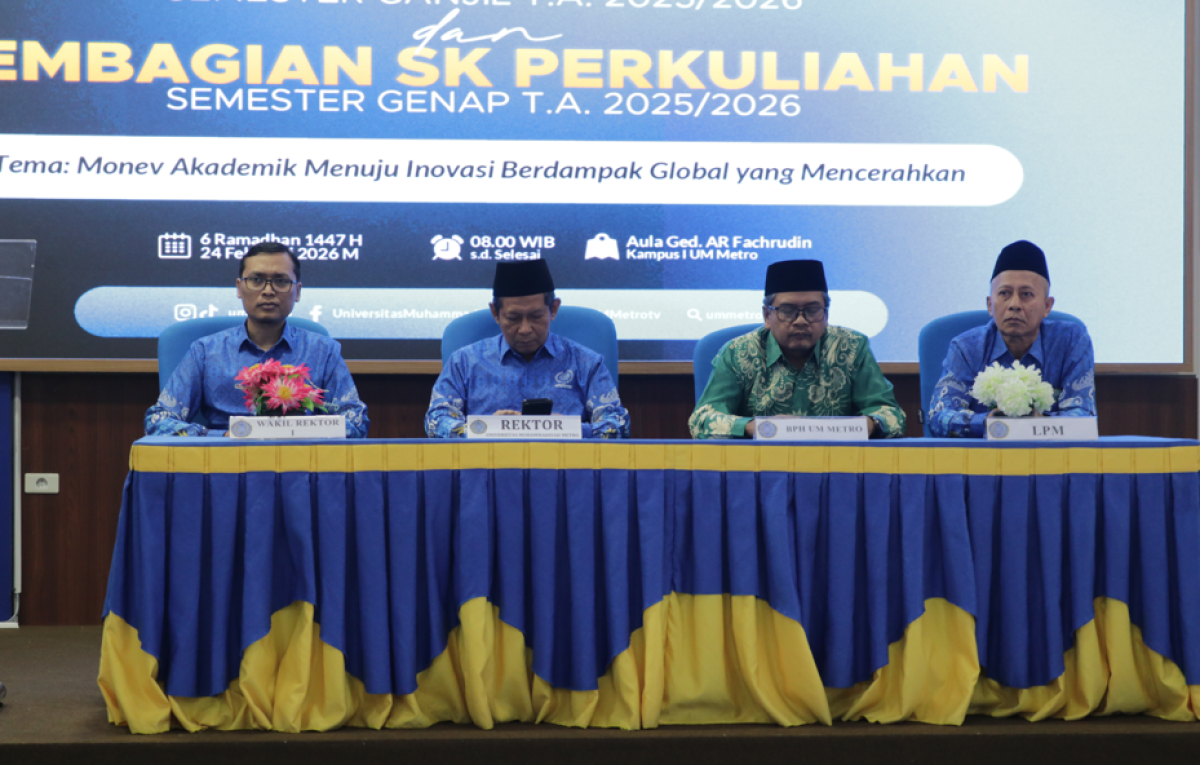 Metro, 24 Februari 2026 - Universitas Muhammadiyah Metro melaksanakan kegiatan Pelaporan Hasil Monitoring dan Evaluasi (Monev) Pelaksanaan Perkuliahan Semester Ganjil T.A. 2025/2026 pada Selasa, 24 Februari 2026 bertempat di Aula Gedung AR Fachrudin Kampus 1 UM Metro.