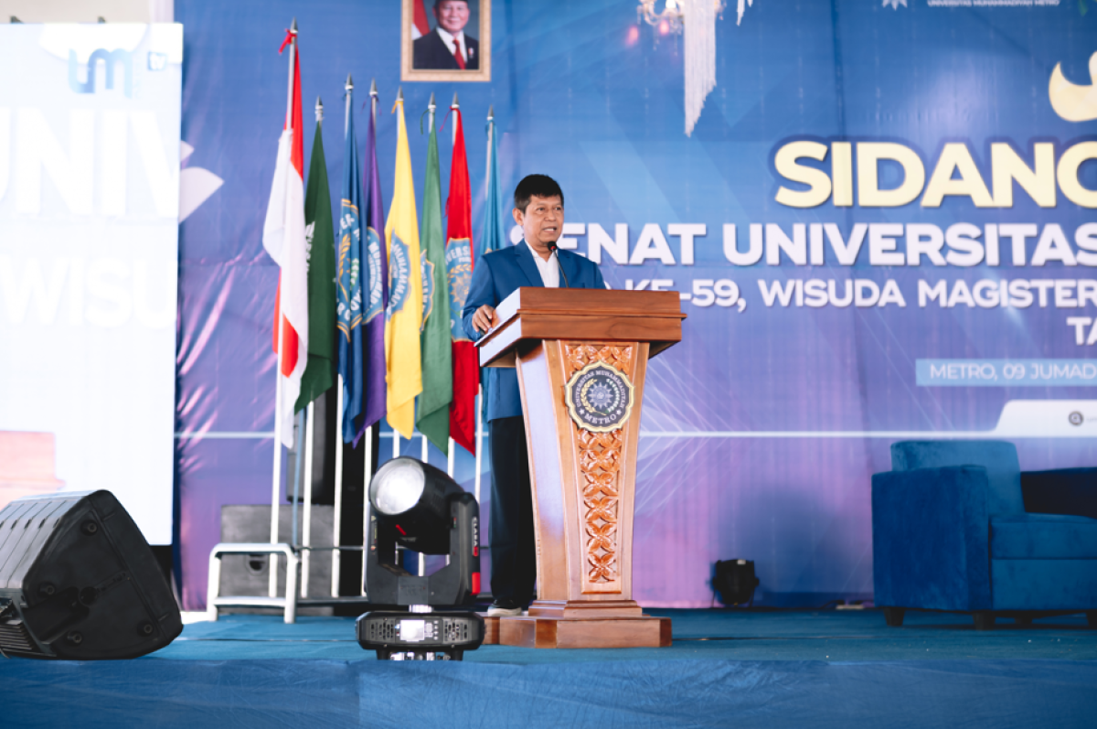 Sambutan selanjutnya disampaikan oleh Rektor Universitas Muhammadiyah Metro Dr. Nyoto Suseno, M.Si. yang menyoroti pentingnya inovasi dan adaptasi bagi para lulusan dalam menghadapi persaingan global. Rektor juga menegaskan komitmen universitas dalam memperluas kerja sama dengan dunia industri dan dunia kerja sehingga alumni dapat memiliki akses yang lebih luas terhadap peluang karier.