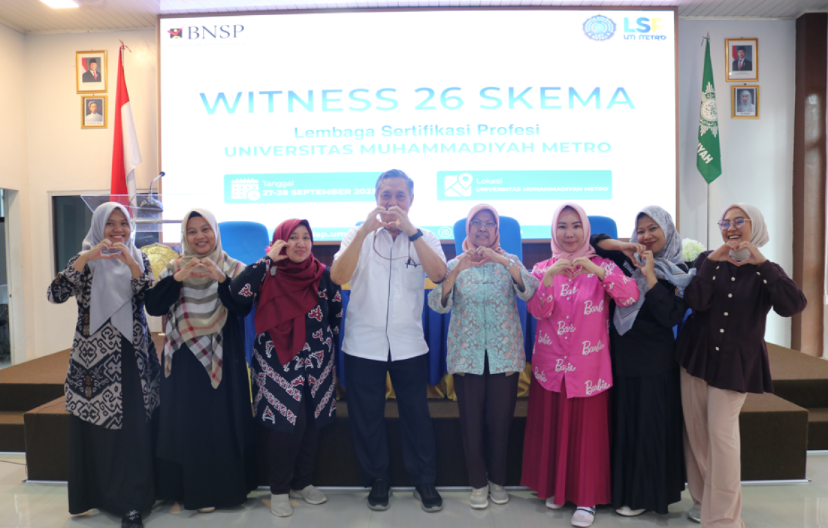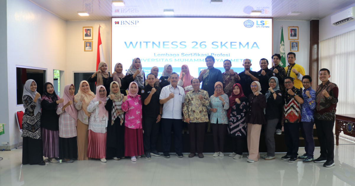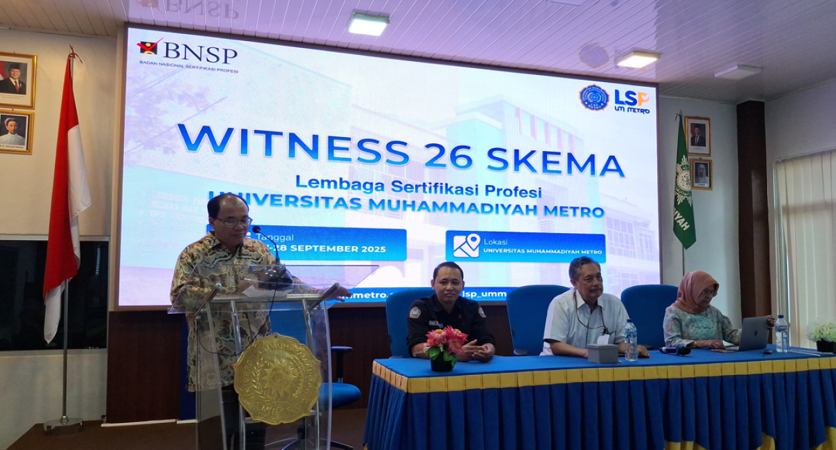 Metro, 27-28 September 2025 - Universitas Muhammadiyah (UM) Metro terus berkomitmen meningkatkan mutu lulusan melalui penguatan sertifikasi profesi. Hal ini diwujudkan dengan terselenggaranya kegiatan Witness 26 Skema yang dilaksanakan oleh Lembaga Sertifikasi Profesi (LSP) UM Metro bekerja sama dengan Badan Nasional Sertifikasi Profesi (BNSP) pada 27–28 September 2025 di Kampus 1 UM Metro.